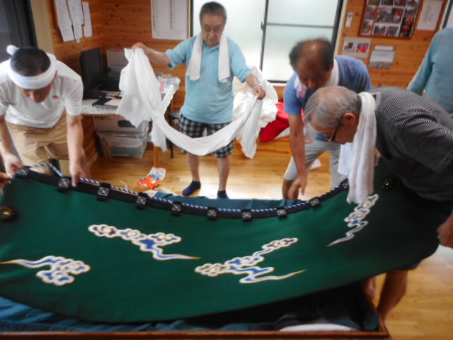 エアコンの効いた室内では、山車の大幕を広げて冷風にあてました。
